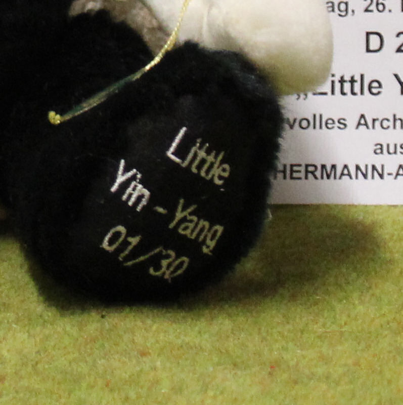 Die linke Fußsohle Sohle ist gestickt auf schwarzen Filz mit dem Namen des Bären "Little Yin-Yang" und der individuellen Limitierungsnummer 01/30Schmuck: der Bär trägt um den Hals ein Band in den Farben schwarz und weiß an dem zwei Glöckchen hängen in den Farben schwarz und weiß