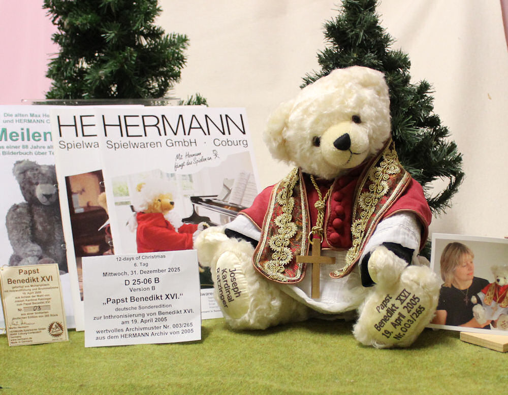 Am 19. April 2005 wurde Joseph Kardinal Ratzinger als 265. Papst in der Geschichte vom Kardinals Kollegium zum Papst Benedikt XVI. gewählt. Es war ein Dienstag und am darauf folgenden Wochenende sollte die Teddybärenmesse "Teddybär Total" stattfinden. Unmittelbar beschlossen wir, einen Papst Benedikt Bären zu "Teddybär Total" vorzustellen. Und tatsächlich, bereits 3 Tage nach der Inthronisierung von Papst Benedikt war unser Modell fertig und wir konnten zu "Teddybär Total" fahren. Dort angekommen standen die Besucher bereits an unserem Messestand Schlange. Jeder wollte unseren Papst Benedikt Bären haben. Die Süddeutsche Zeitung schrieb am 6. Mai 2005 auf ihrer Titelseite, Zitat: "Es ist ein Bär, wie ihn die Welt noch nicht gesehen hat". Papst Benedikt selbst erhielt am 9. Mai 2005 von uns die Nr. 265 dieses Teddys als Geschenk, da er der 265. Papst in der Geschichte war, und der Vatikan bedankte sich im Namen seiner Heiligkeit am 27. Mai 2005 in einem an uns gerichteten direkten Dankesschreiben für diesen Bären. Seither begleiteten wir Papst Benedikt auf seinem weiteren Lebensweg mit den unterschiedlichsten Modellen in den unterschiedlichsten Limitierungen.
