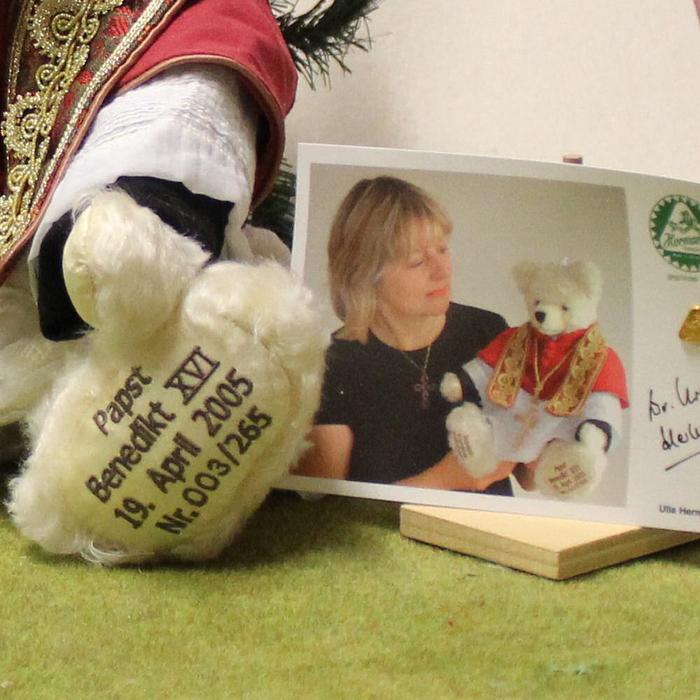 On April 19, 2005, Joseph Cardinal Ratzinger was elected Pope Benedict XVI by the College of Cardinals as the 265th Pope in history. It was a Tuesday, and the following weekend the Teddy Bear Fair "Teddy Bear Total" was to take place. We immediately decided to present a Pope Benedict Teddy Bear at "Teddy Bear Total." And indeed, just three days after Pope Benedict's enthronement, our model was finished, and we were able to go to "Teddy Bear Total." Upon arrival, visitors were already queuing at our booth. Everyone wanted our Pope Benedict Bear. The Süddeutsche Zeitung wrote on its front page on May 6, 2005, quote: "It is a bear the likes of which the world has never seen". Pope Benedict himself received number 265 of this Teddy Bear as a gift from us on May 9, 2005, because he was the 265th Pope in history, and the Vatican, in the name of His Holiness, expressed its gratitude for this Bear in a direct letter addressed to us on May 27, 2005. Since then, we have accompanied Pope Benedict on his subsequent life journey with a wide variety of models in various limited editions.
