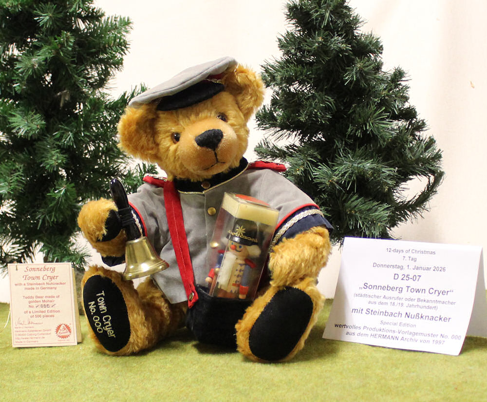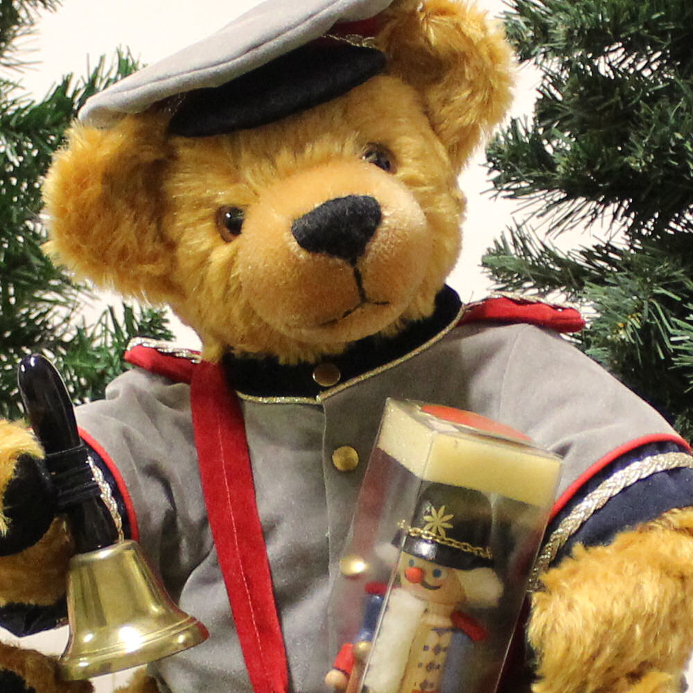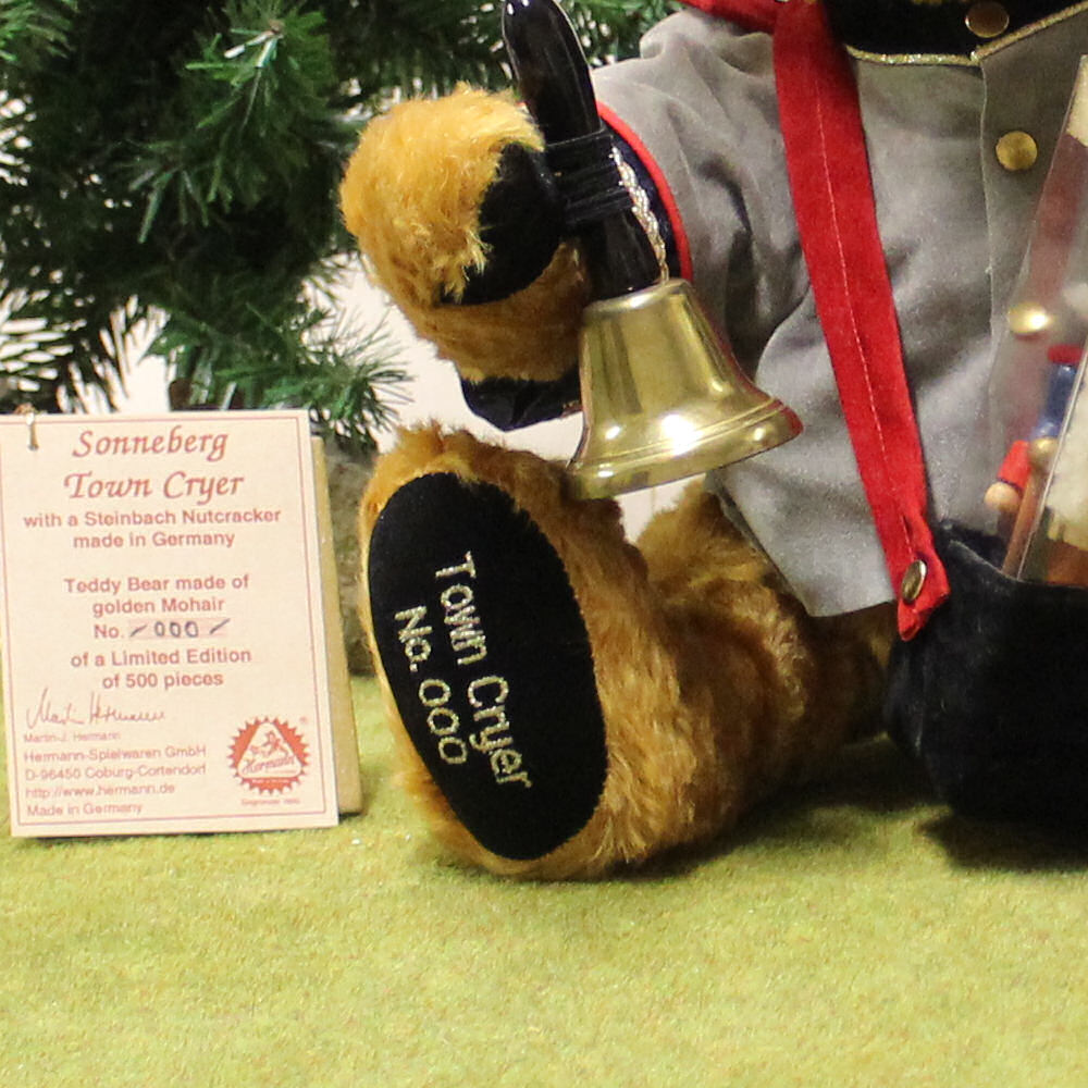 Zubehör: der Bär trägt in der rechten Hand eine "Ausrufer-Glocke". Im linken Arm hält der Bär einen Original "Nußknacker" der Firma "Volkskunst Steinbach"