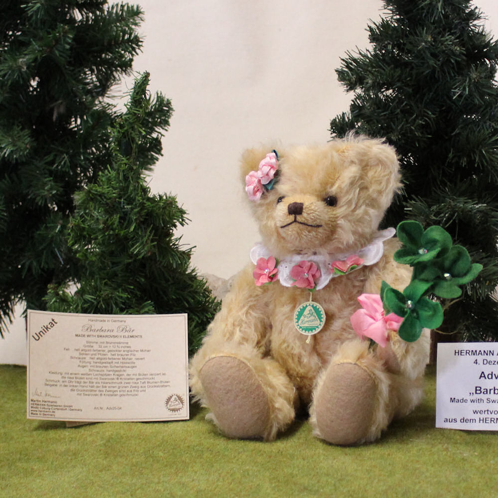Today is St. Barbara's Day. According to an old Christian legend, the Virgin Barbara was martyred on December 4th, 306 AD, for her unwavering faith. The lore tells us that on Christmas Day, the branches on her grave began to bloom. Faith and superstition have preserved the custom of cutting branches from the garden on St. Barbara's Day, which should then bear blossoms by Christmas Day. Therefore here today at the Tteddy-Fabrik, the 4th of December is also dedicated to Saint Barbara. Just like St. Barbara's branches, our "Barbara Bear," with its light fur and sparkling crystals on its collar and branches, is meant to brighten up our homes during the winter season.