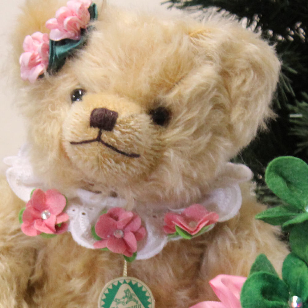 Schmuck: am Ohr trägt der Bär als Haarschmuck zwei rosa Taft Blumen-Blüten