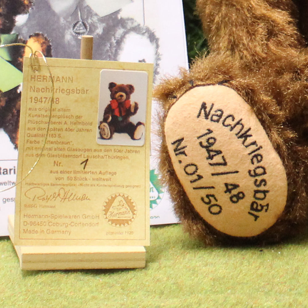 Stickerei: die rechte Fußsohle ist bestickt mit dem Namen des Bären "Nachkriegsbär 1947/48" und der individuellen Limitierungsnummer Nr. 01/50
