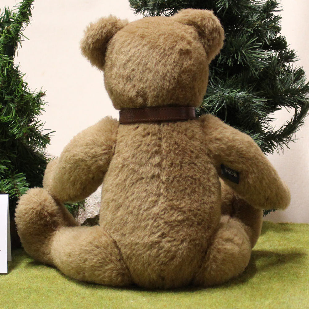 wertvoller Schmuck: der Bär trägt ein braunes Leder-Halsband, das von Hugo Boss bei uns angeliefert wurde