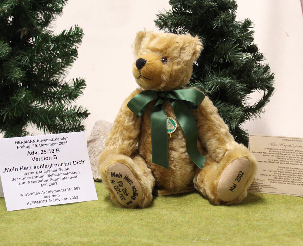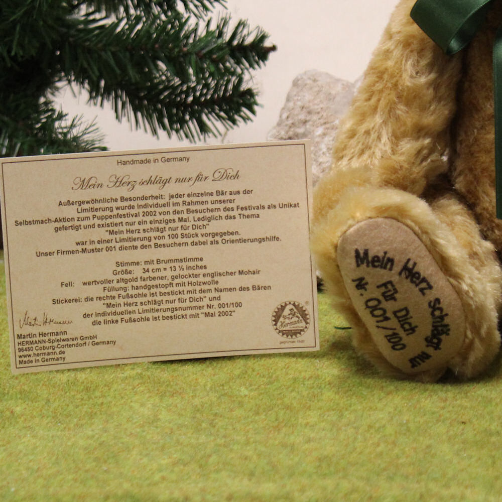 Außergewöhnliche Besonderheit: jeder einzelne Bär aus der Limitierung wurde individuell im Rahmen unserer Selbstmach-Aktion zum Puppenfestival 2002 von den Besuchern des Festivals als Unikat gefertigt und existiert nur ein einziges Mal. Lediglich das Thema "Mein Herz schlägt nur für Dich" war in einer Limitierung von 100 Stück vorgegeben. Unser Firmen-Muster 001 diente den Besuchern dabei als Orientierungshilfe.
