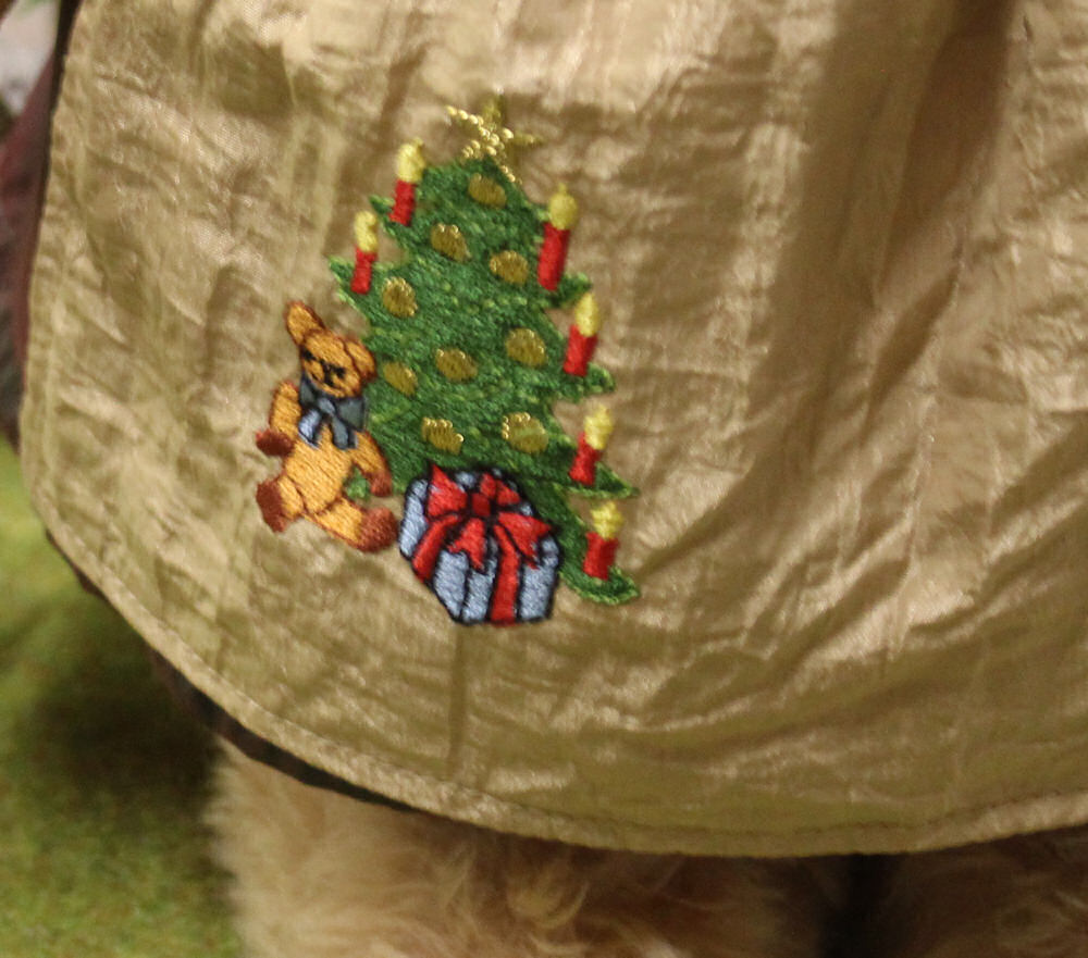 außergewöhnliche, besonders kostbare Stickerei Dirndl-Schürze: Die Schürze des Dirndls ist wertvoll bestickt nach einer Zeichnung von Ulla Hermann mit einem Weihnachtsbaum und einem Teddybär, der unter dem Weihnachtsbaum sitzt.