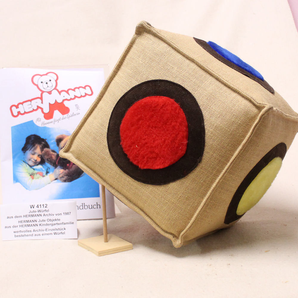 Besonderheit Einnähetikett: bei dem HERMANN-Einnähetikett fürden Würfel handelt es sich um ein Einnähetikett, das ca. Ende der1980er Jahren verwendet wurde, wo die Abbildung unseres Markenzeichens "derBär mit dem laufenden Hund" noch in grüner Farbe aufgedruckt ist.Dies beweist u.a., dass dieser Würfel gegen Ende der 1980er Jahrehergestellt wurde, da das Format früherer Einnähetikettenlänglicher war und bei früheren Einnähetiketten die damaligePostleitzahl für Coburg aufgedruckt war. Bei später verwendetenEinnähetiketten wurde der Text und die Abbildung dann ganz einfarbigin schwarz aufgedruckt.