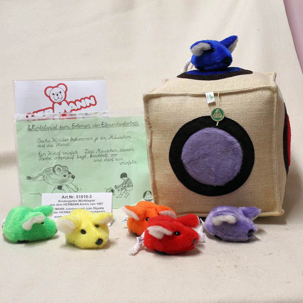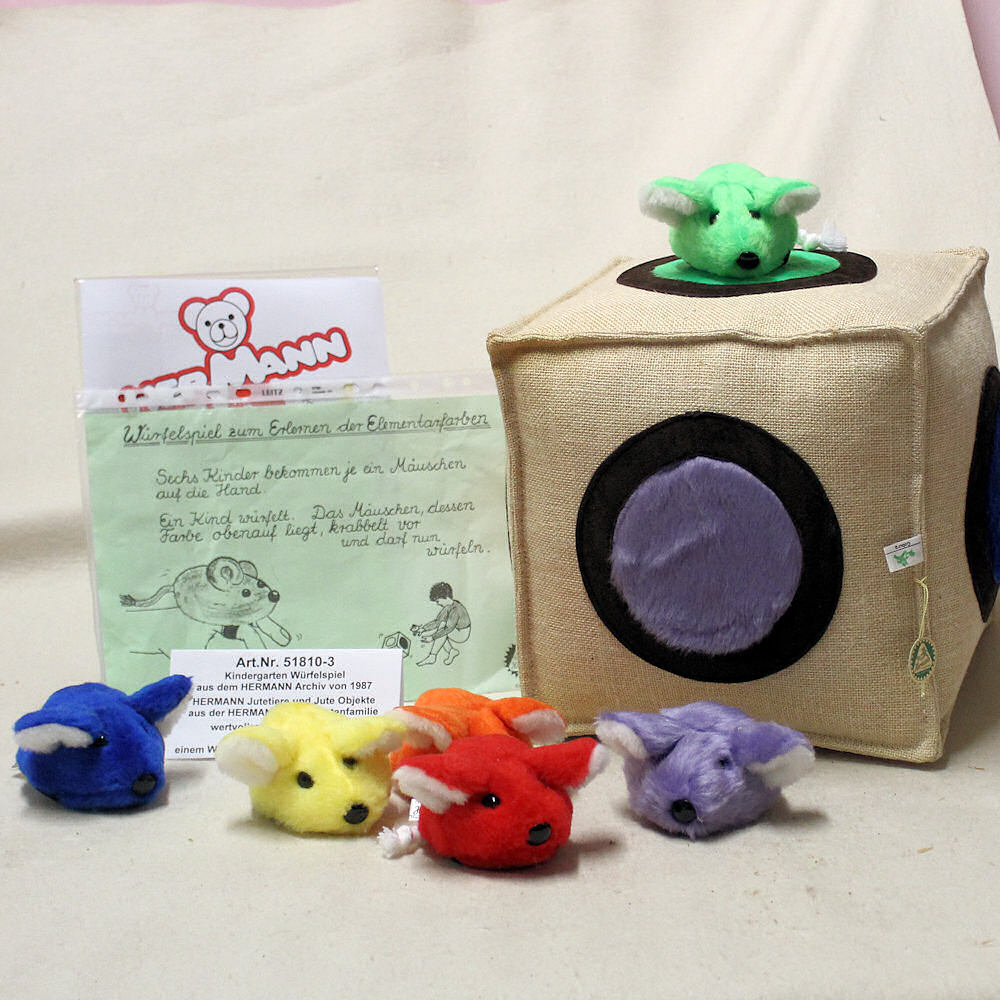 7-teiliges Kindergartenspiel bestehend aus: einem großen Würfelund 6 bunten Krabbelmäusen mit SpielanleitungArchiv-Einzelstück: aus dem HERMANN-Archiv von 1987