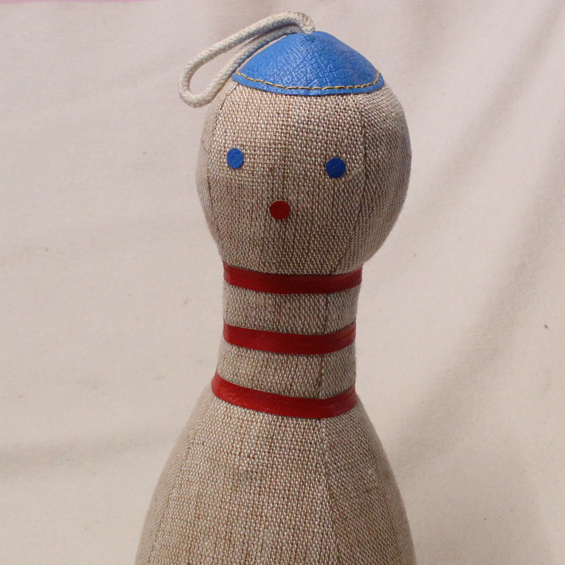 Material: Rupfen-Material aus Zuckersäcken, verarbeitet mit blauen Lederteilen als Hut