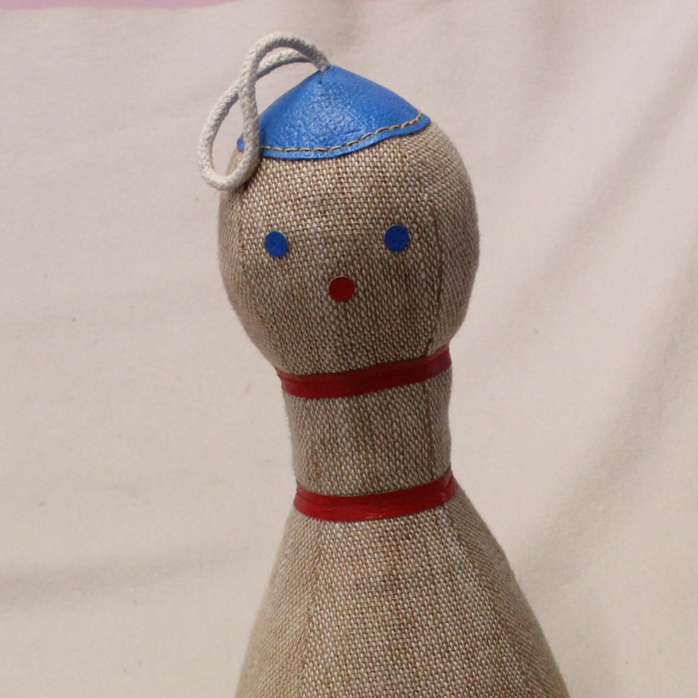 Material: Rupfen-Material aus Zuckersäcken, verarbeitet mit blauen Lederteilen als Hut