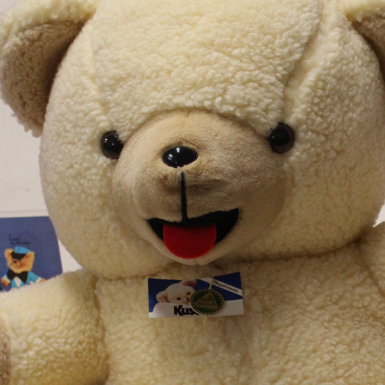 Modell: großer sitzender Bär, nicht gegliedert, mit offenem Maul,HERMANN-Anhängeplombe und "Kuschel"-Anhängeetikett