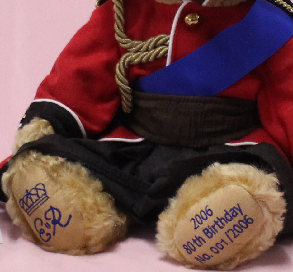Die linke Sohle ist bestickt mit dem Jahr 2006 und "80th Birthday" und derindividuellen Limitierungsnummer 001/2006.Kleidung: der Bär ist sehr hochwertig gekleidet mit der Garde-Uniformvon Queen Elizabeth zu "Trooping the Colour", der Geburtstagsparade von QueenElizabeth II.