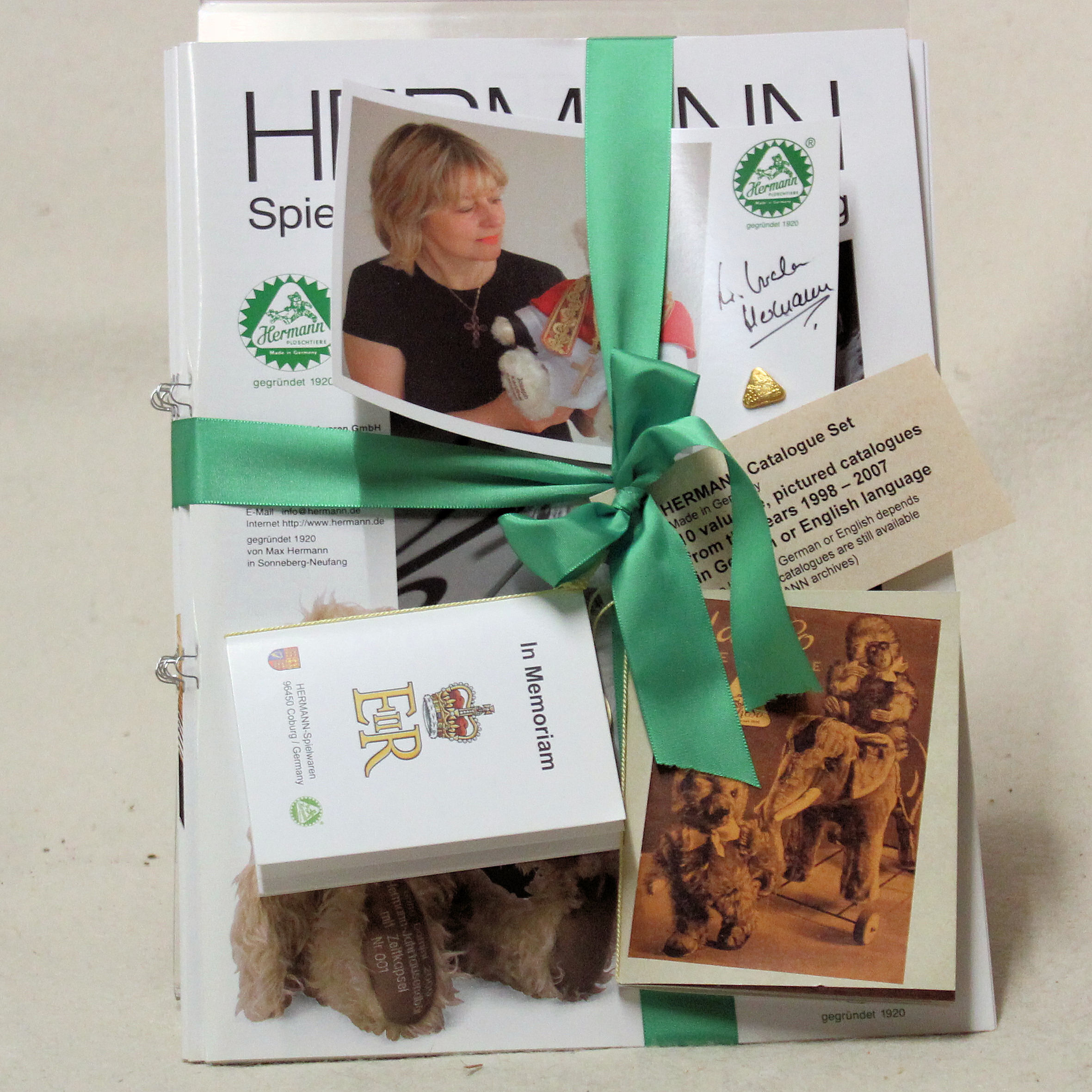 Im Katalog-Set sind jetzt neu zwei Mini-Bücher integriert über die HERMANN-Historie und über Teddybären für die verstorbene Queen Elizabeth. Außerdem ist jetzt neu jedem Set eine Ulla Hermann Autogramm-Karte mit einem echt vergoldeten HERMANN-Pin beigegeben.