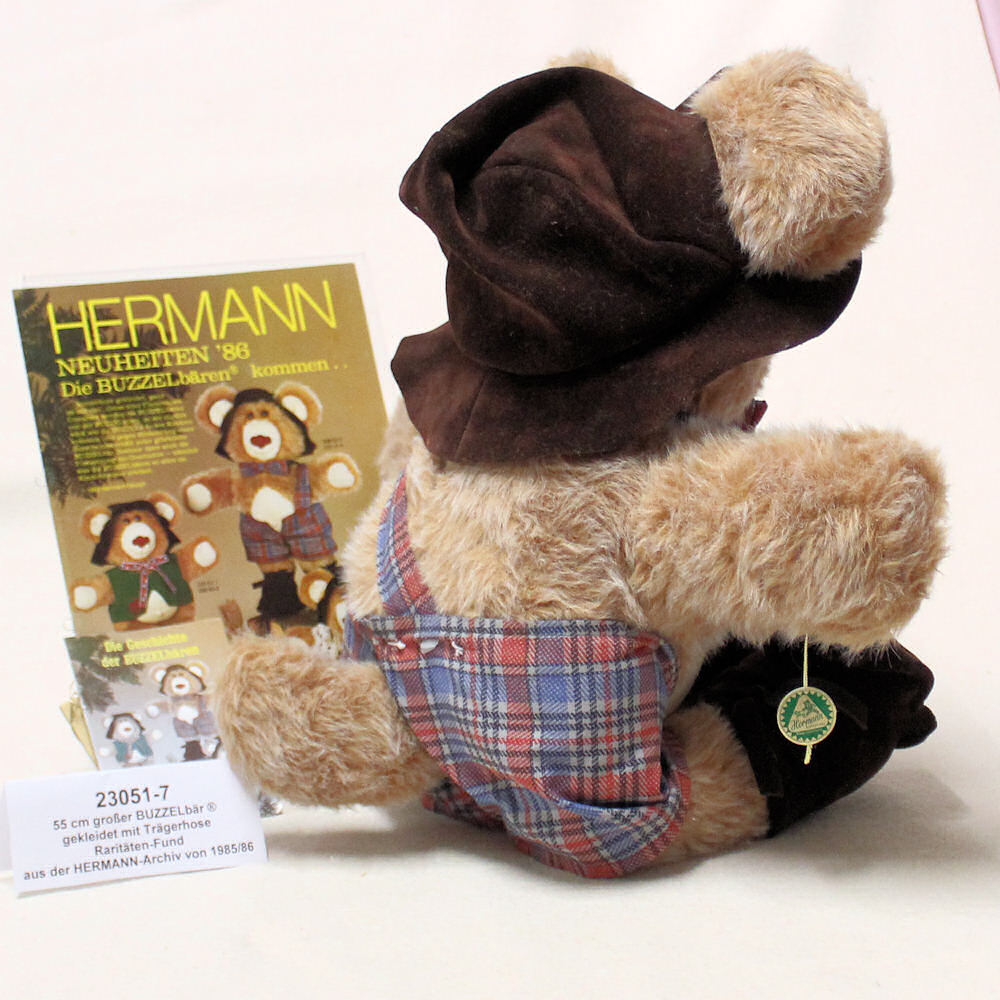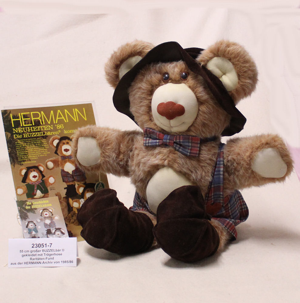 Gefertigt wurden die BUZZELbären ® bis einschließlich 1989bis mit dem "Teddybär zum Tag der Deutschen Einheit" unser über100 Jahre alter HERMANN Klassiker 1990 wieder die Herrschaft in unsererKollektion übernahm, jetzt vornehmlich als Teddybär für erwachseneSammler.