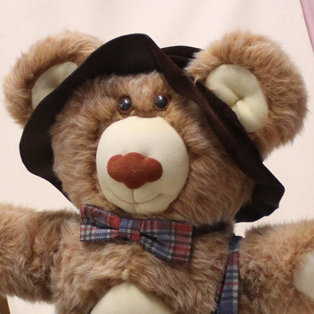 Hut und Stiefel sind aus dunkel-braunem Velourleder-Imitat genäht.Beigaben: HERMANN Katalog von 1986 und als Echtheitszertifikat beigegebendas kleine Anhänger-Heft mit der bebilderten Geschichte derBUZZELbären ® .