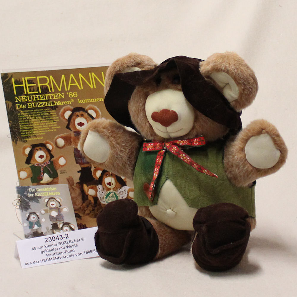 Nicht zuletzt wegen ihrer aufwendigen und lohnintensiven Herstellungsartgibt es die BUZZELbären ® schon lange nicht mehr. Zwei unserer altenBUZZELbären ® haben sich jedoch in unserem Archiv versteckt. Nach40 Jahren freuen sie sich heute darauf, irgendwo auf dieser Welt ein neuesZuhause zufinden, um als wertvolles Dokument Zeugnis zu geben von einembesonderen Bärenmodell aus unserer über 100 Jahre alten HERMANNFirmengeschichte.
