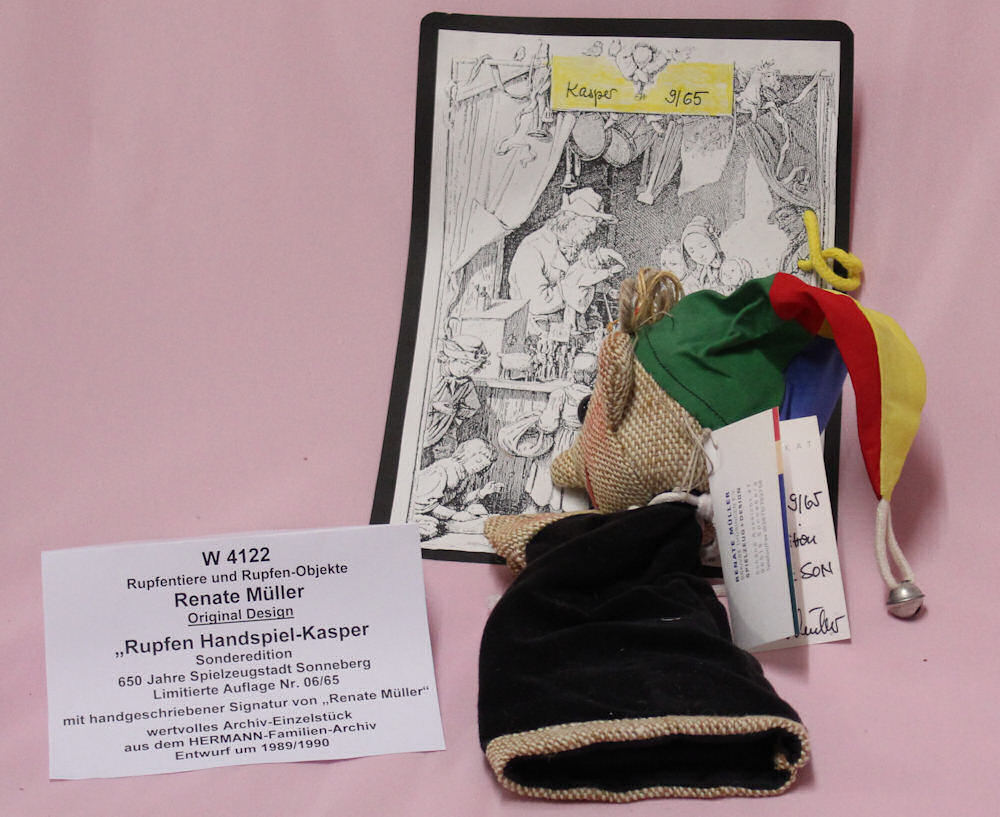 Beigabe: Der Kasper ist aufgebunden auf einem schwarz/weiß Druckvom Sonneberger Kasper und einem Farb-Bild von Rupfentieren aus der Werkstattvon Renate Müller. Sowohl auf dem schwarz/weiß Druck vom SonnebergerKasper als auch auf dem Farb-Bild von Rupfentieren von Renate Müllerist die Limitierungsnummer 9/65 handschriftlich vermerkt. Auf derRückseite des Farb-Bilds mit den Rupfentieren von Renate Müllerist die Biographie von Renate Müller aufgedruckt.