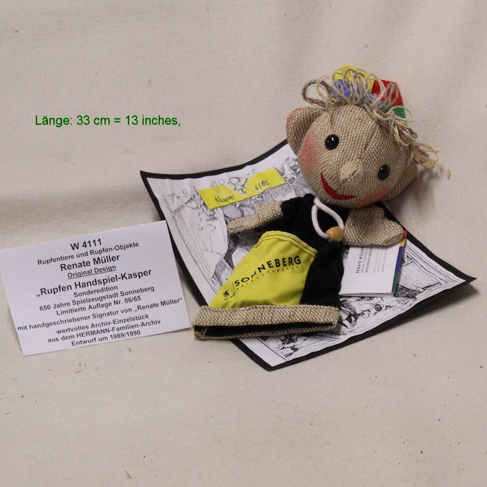 Besonderheit: im Körper befindet sich ein von Renate Müller handgeschriebenes Einnähetikett mit Unterschrift von "Renate Müller" und "Sonneberg Kasperle 06/65"