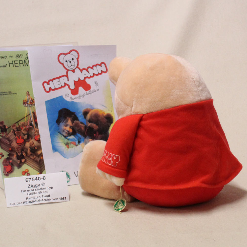 Besonderheit: bei dem HERMANN-Einnähetiketthandelt es sich um ein Einnähetikett, das wir in den 1980er Jahren verwendethaben, wo die Abbildung unseres Markenzeichens "der Bär mit dem laufendenHund" noch in grüner Farbe aufgedruckt ist. Dies beweist, dass dieseZiggy Figur in den 1980er Jahren hergestellt wurde, da bei späterverwendeten Einnähetiketten der Text und die Abbildung einfarbig inschwarz aufgedruckt wurde.